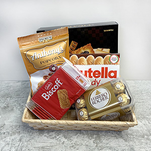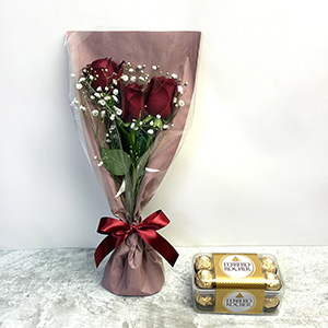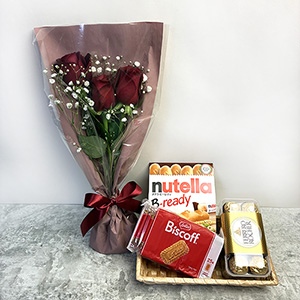 & Sweets A mini bouquet with 3 roses and baby’s breath, paired with a sweets set. |
